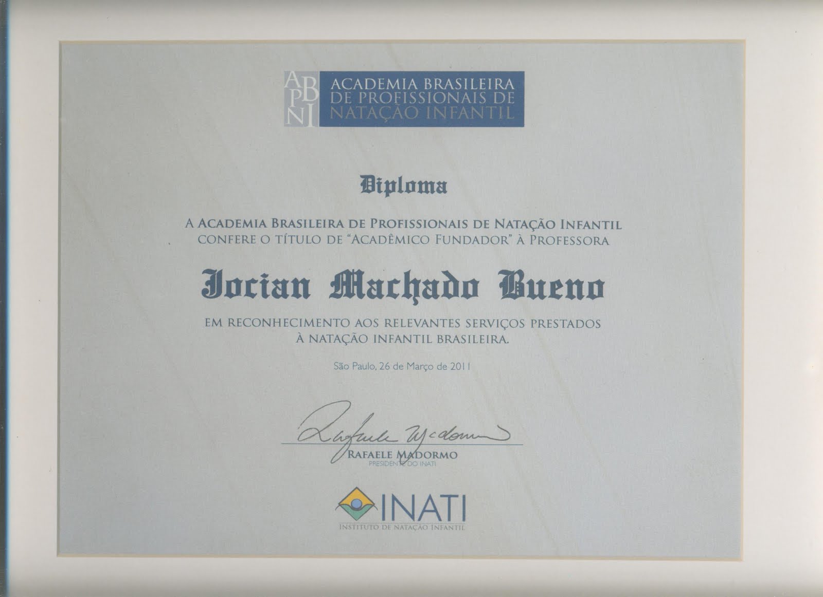 No evento, Jocian participou como palestrante e no dia 26 de março de 2011, Jocian Machado Bueno recebeu o Título de "ACADÊMICO FUNDADOR" pela Academia Brasileira de Profissionais de Natação Infantil.
